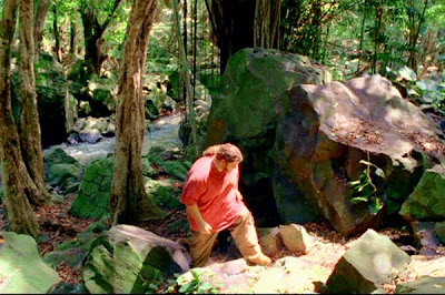 A narrow stream meanders through the forest, every so often encountering a small drop.  In the season 1 finale Jack, Hurley, Arzt et. al. crossed the water here on their way to the Black Rock.
